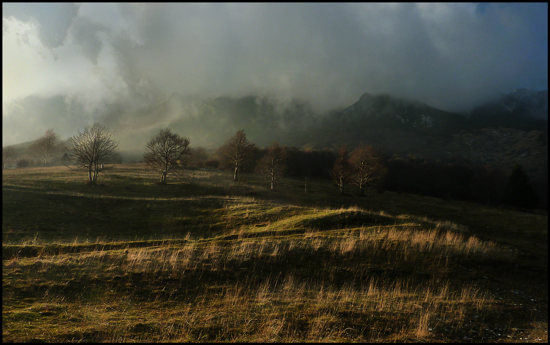 Interessante l'anlternanza tra luci/ombre e vegetazione a terra. Più dietro il temporale con i suoi nuvoloni combattono aspramente con le montagne.