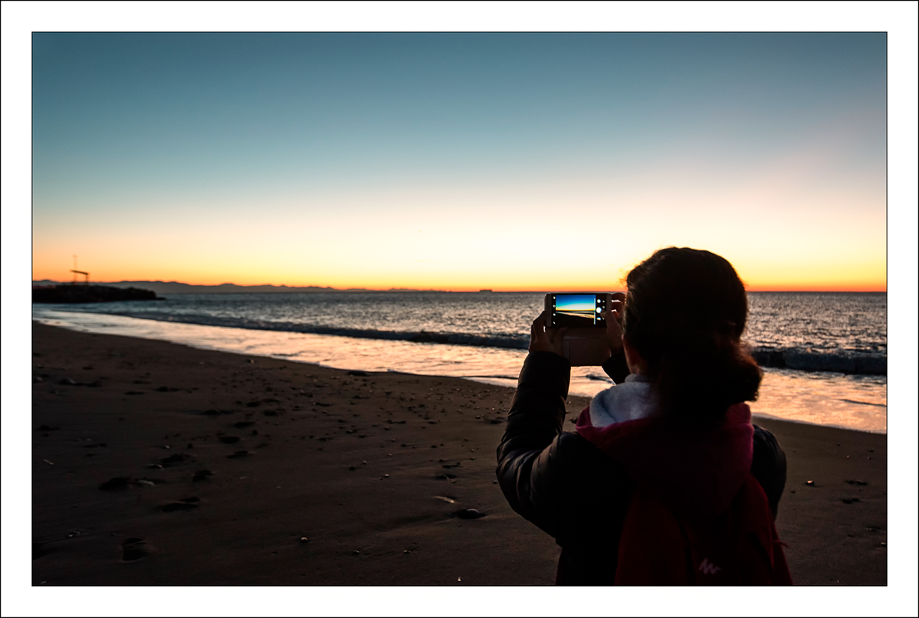 La foto mi piace molto , diagonali di luce che si dipartono dalla punta , il cellulare sulla linea dell'orizzonte una perla ... beh.. si! quella fotografa la invidio un pò