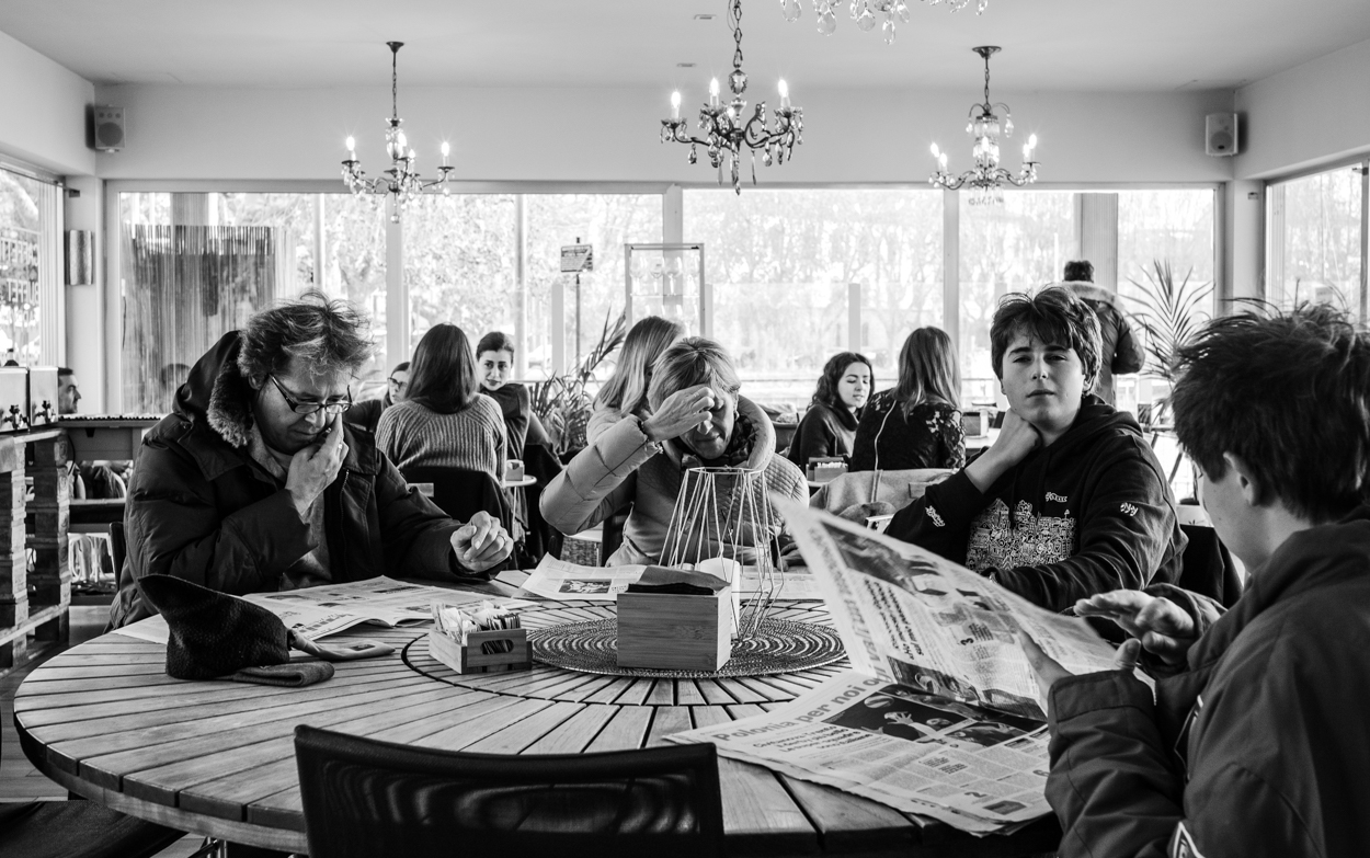 Un interessante campionario di espressioni,di realtà.Tutti insieme allo stesso tavolo ma nessuno realmente in compagnia. ognuno perso nel suo mondo e nelle sue cose. Un po' un peccato il taglio brusco a dx ma immagino non semplice un' alternativa.Mi piace moltissimo il bn che hai ottenuto. Una proposta interessante Ciao