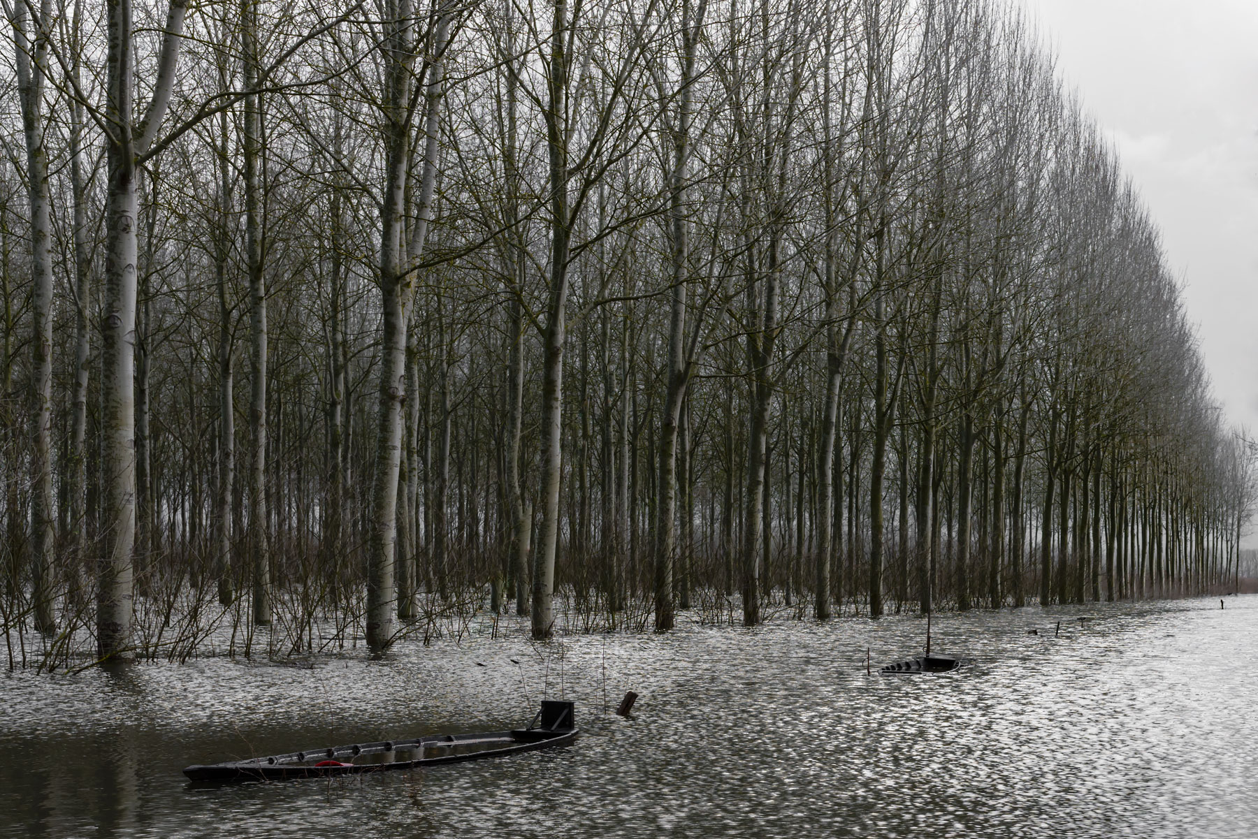 Immagine di gran fascino Luca! Le cromie creano un' atmosfera misteriosa,cupa.. Un senso di resa nei confronti di un destino un poco triste,con queste barche che sembrano cercare di lottare inermi contro l'acqua che sale.Acqua e terra che diventano un tutt'uno,e i filari di alberi creano un elegante ricchissimo esercito. Si,ci puoi giocare a livello di taglio,anche se questo progressivo decrescere degli alberi da molta profondità e non mi dispiace. Complimenti,davvero bella e ci metto una stellina