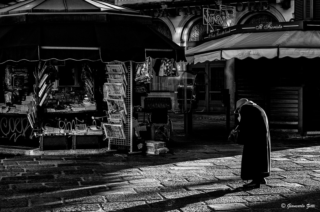 Bellissima luce e BN ben condotto, il risultato è una scena degna di un film noir, mi piace molto l'interpretazione che hai dato della scena. Magari manca del pun graffiante di molte foto street, ma è comunque in grado di raccontare una storia (in realtà infinite storie). Composizione e taglio ottimi, tutto è equilibrato e gradevole.