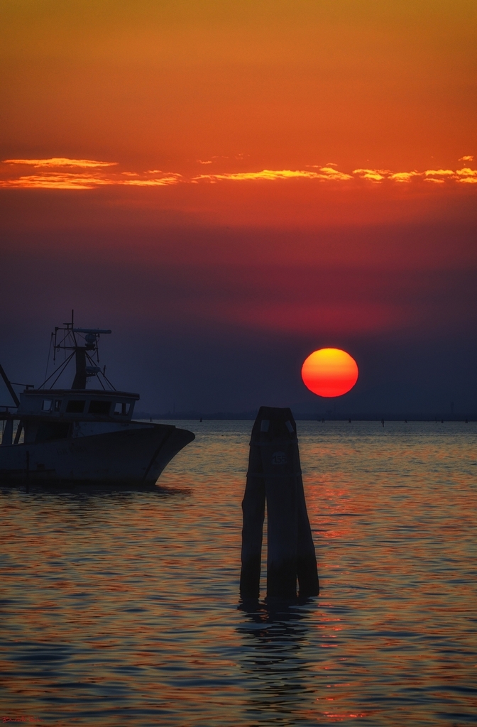 un tramonto quasi africano, dai colori e dalla dimensione del sole ! Molto piacevole e inusuale il taglio verticale .. D'atmosfera decisamente anche il gioco di luci sull'acqua! La barca mozzata mi lascia un poco dubbiosa... _________________ "Fotografare mi serve a non morire"