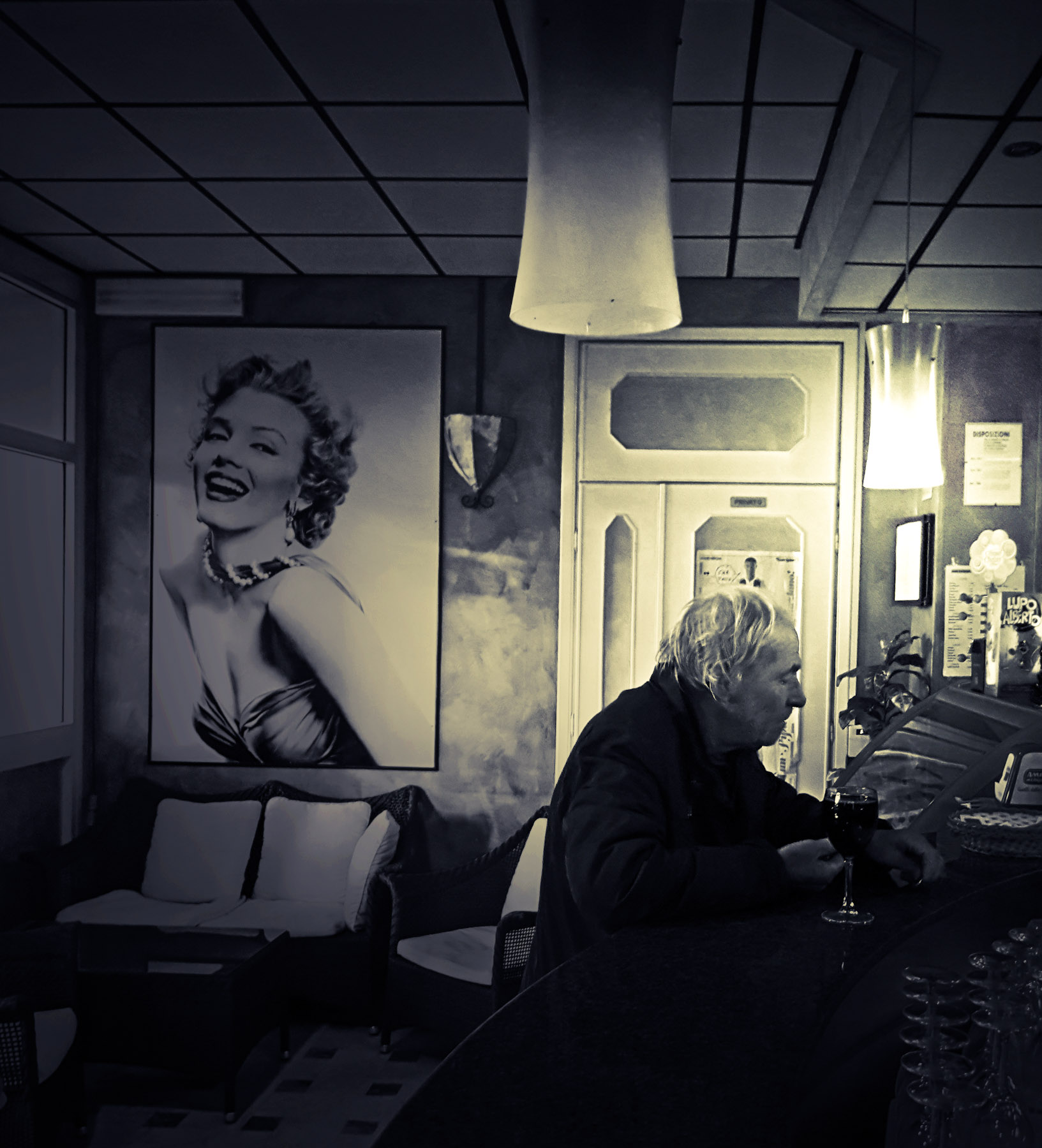 A fianco, la solitudine nella sua accezione più lampante, quella di un vecchio al bar, con l'unica compagnia di un "rosso routine dentro al bicchiere".