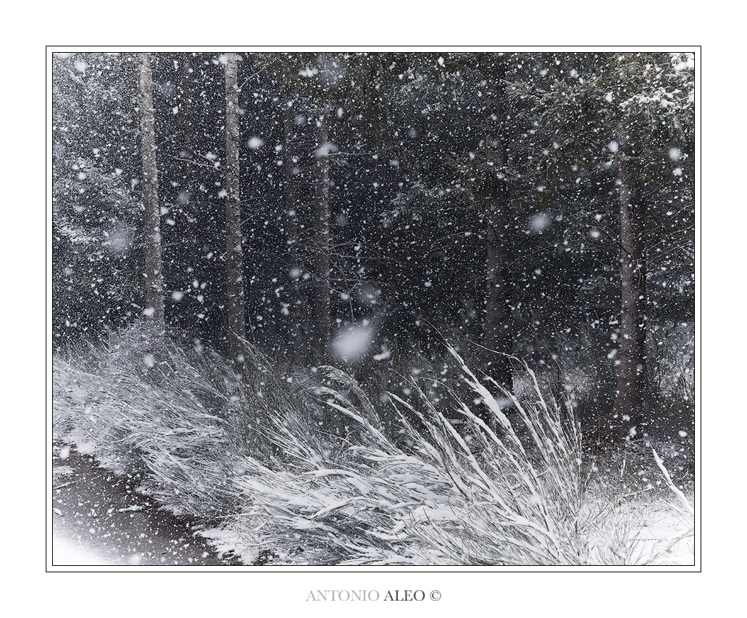 Punti luminosi che accendono lo scatto, in un'ambiente fortemente caratterizzato da un primo piano nitido e ben visibile delle piante provate dal vento e dalla neve, rispetto ad uno sfondo più "misterioso" e parzialmente nascosto dal nero.