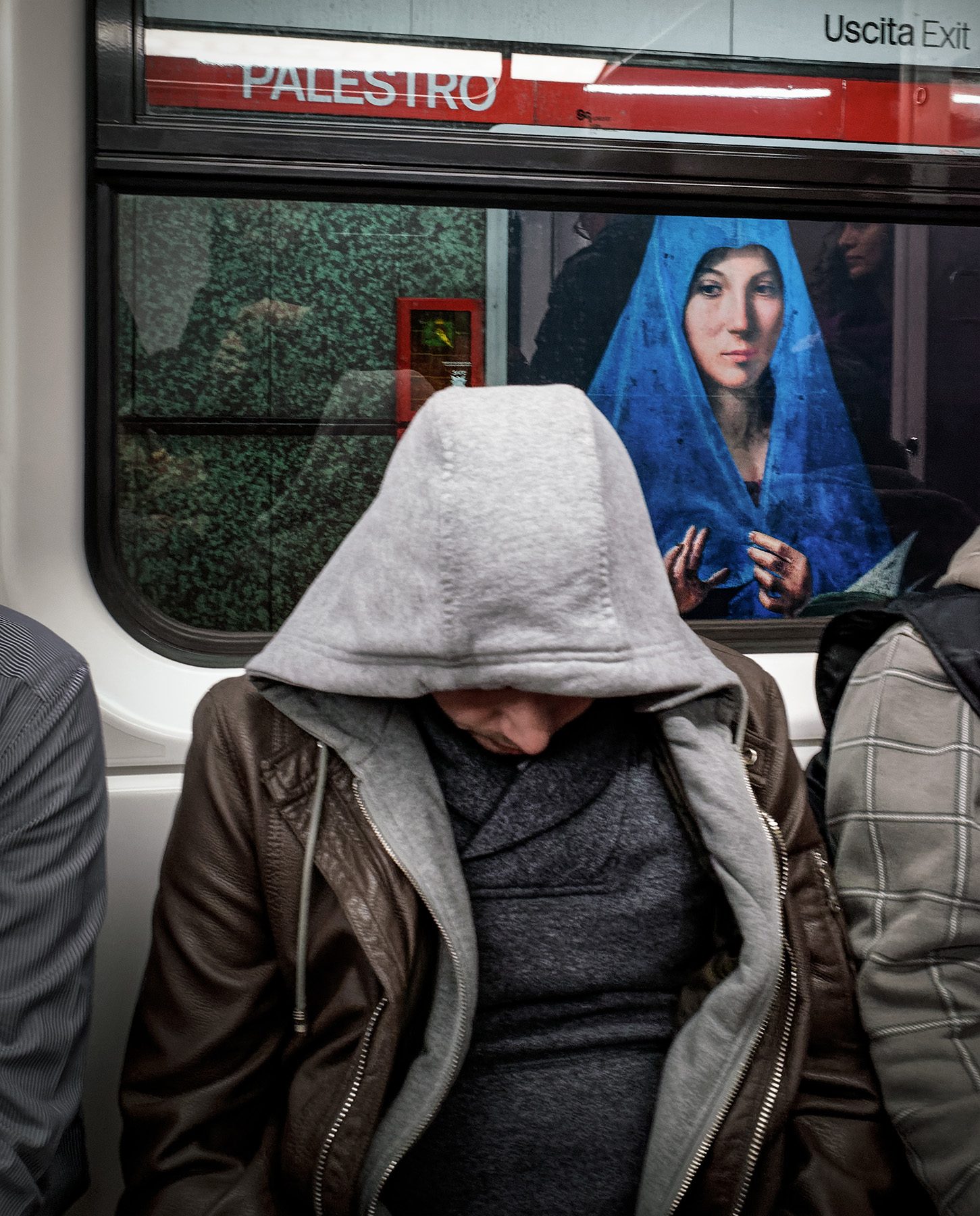 Avevo valutato il taglio quadrato: sicuramente aiuterebbe nell'associazione fra i due elementi, ma allo stesso tempo non vorrei perdere i dettagli del contesto in cui è stata ripresa la scena. In particolare il fatto che il manifesto sia affisso fuori dal vagone e lungo la banchina della stazione della metro.