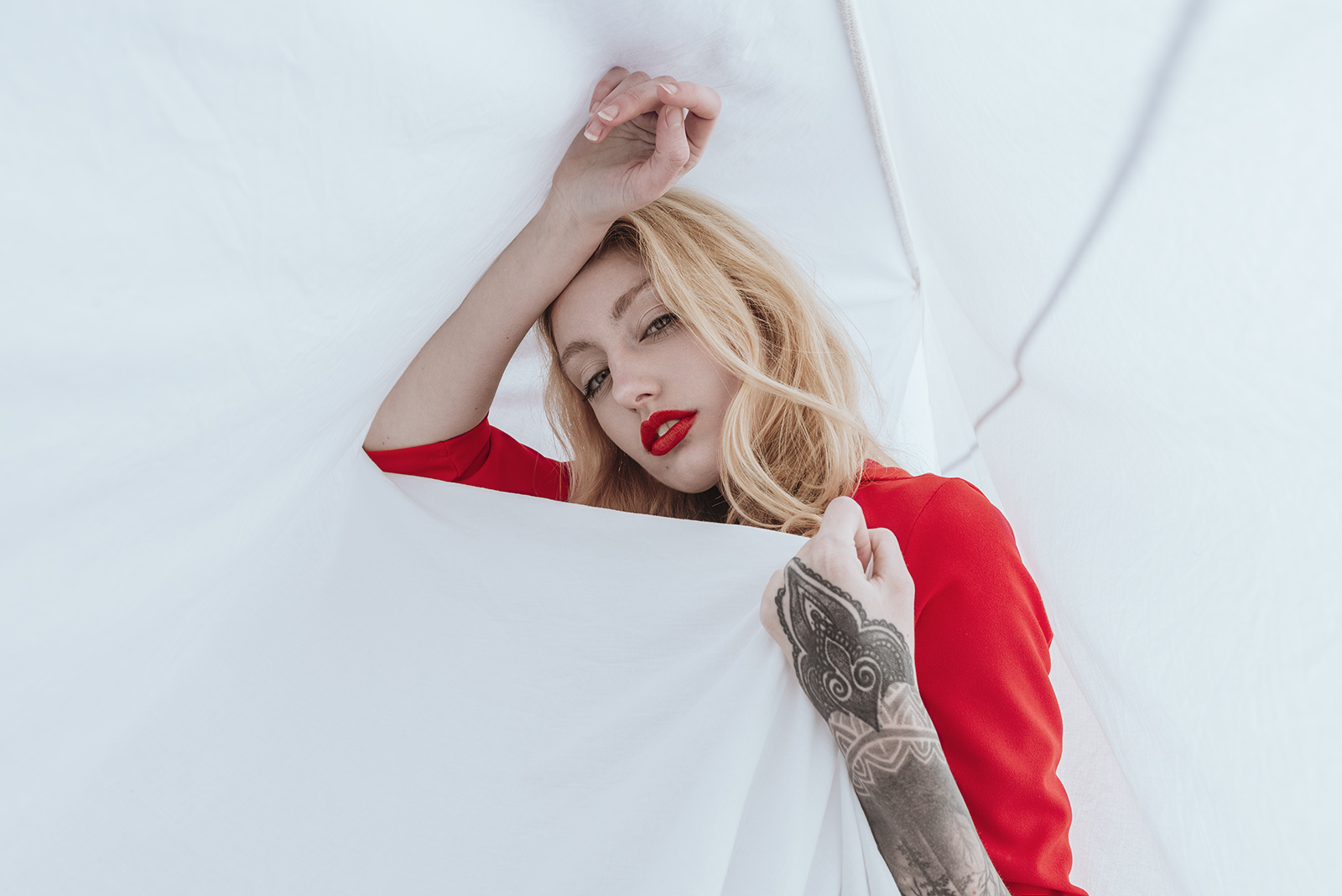 Come sempre un bellissimo lavoro per una foto di classe, molto di impatto il rosso su tutto quel bianco, la modella ha il giusto mood.