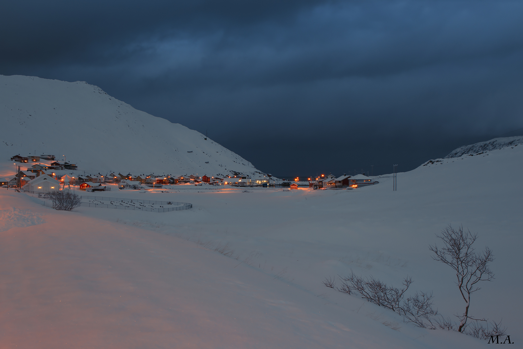 La foto che ho postato quì si riferisce al paese dove c'era il campo base per poi raggiungere capo Nord (a una decina di km di distanza), il suo nome è Skarsvag ed è l'ultimo paese abitato a Nord dell'Europa continentale, 50 abitanti totali, poche case, un porticciolo, una chiesa e qualche sparuta e piccola piantina nella distesa sterile della tundra artica.