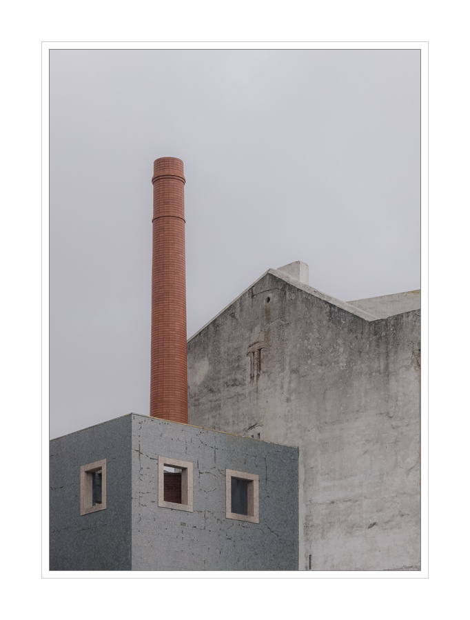 L'inseguirsi dei grigi, appena scaldato dal mattone ciminiera, dà un senso guizzante alla staticità del tutto.