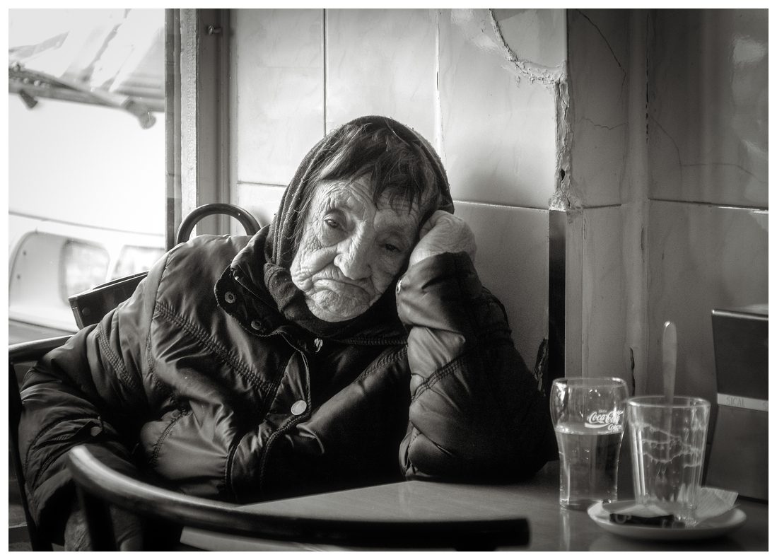 Un viso scolpito dalla vita, una vita che non sembra aver donato molto. Hai colto questa espressione persa, pensierosa. La bocca dalle labbra sottili sorprese in un espressione triste. Anche l'ambiente trasmette questa sensazione di tristezza, piastrelle rotte, così come lo spigolo del muro, il tavolo non sparecchiato con ancora il bicchiere della consumazione precedente....
