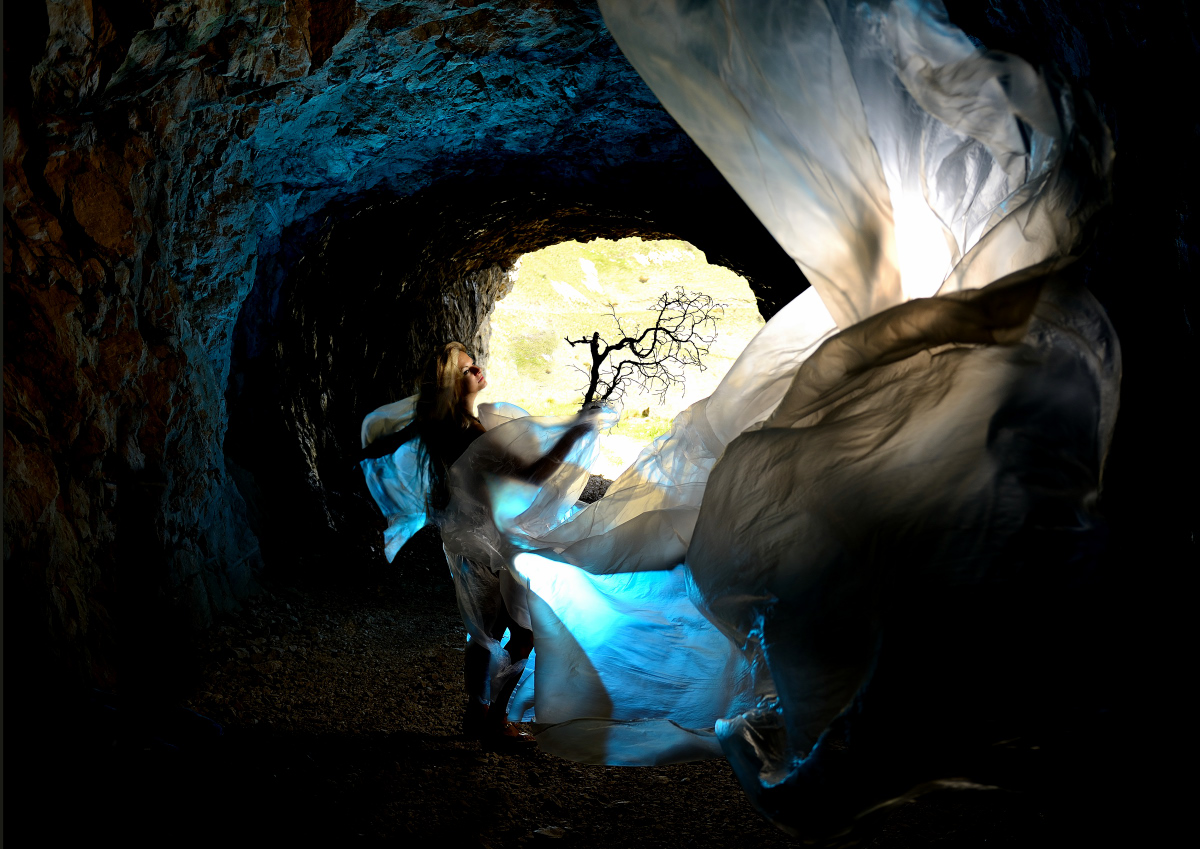 | Il mantello è stato realizzato con il nylon leggerissimo, quello per ricoprire i mobili quando si tinteggia. Il forte vento nella galleria lo faceva veleggiare vorticosamente. Flash schermato con gelatina azzurra e altro flash come luce principale sulla destra della modella |