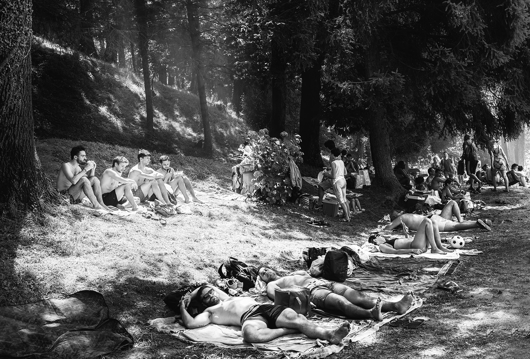 Direi che si tratta proprio di un tipico quadretto estivo, dove le Persone per affrontare il Caldo fanno di tutto, anche conquistare un centimetro di pineta, gomito a gomito per poi tuffarsi in un super affolato lago