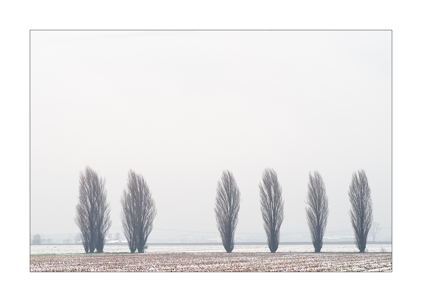 Tre, due e poi uno, uno, uno, uno...alberi eleganti su campi graffiati e tono su tono nel freddo respiro padano.