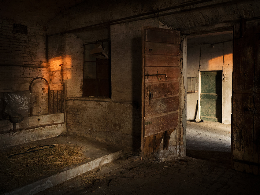 | Una porta semiaperta, un corridoio, una vecchia stalla abbandonata, la luce del tramonto. |