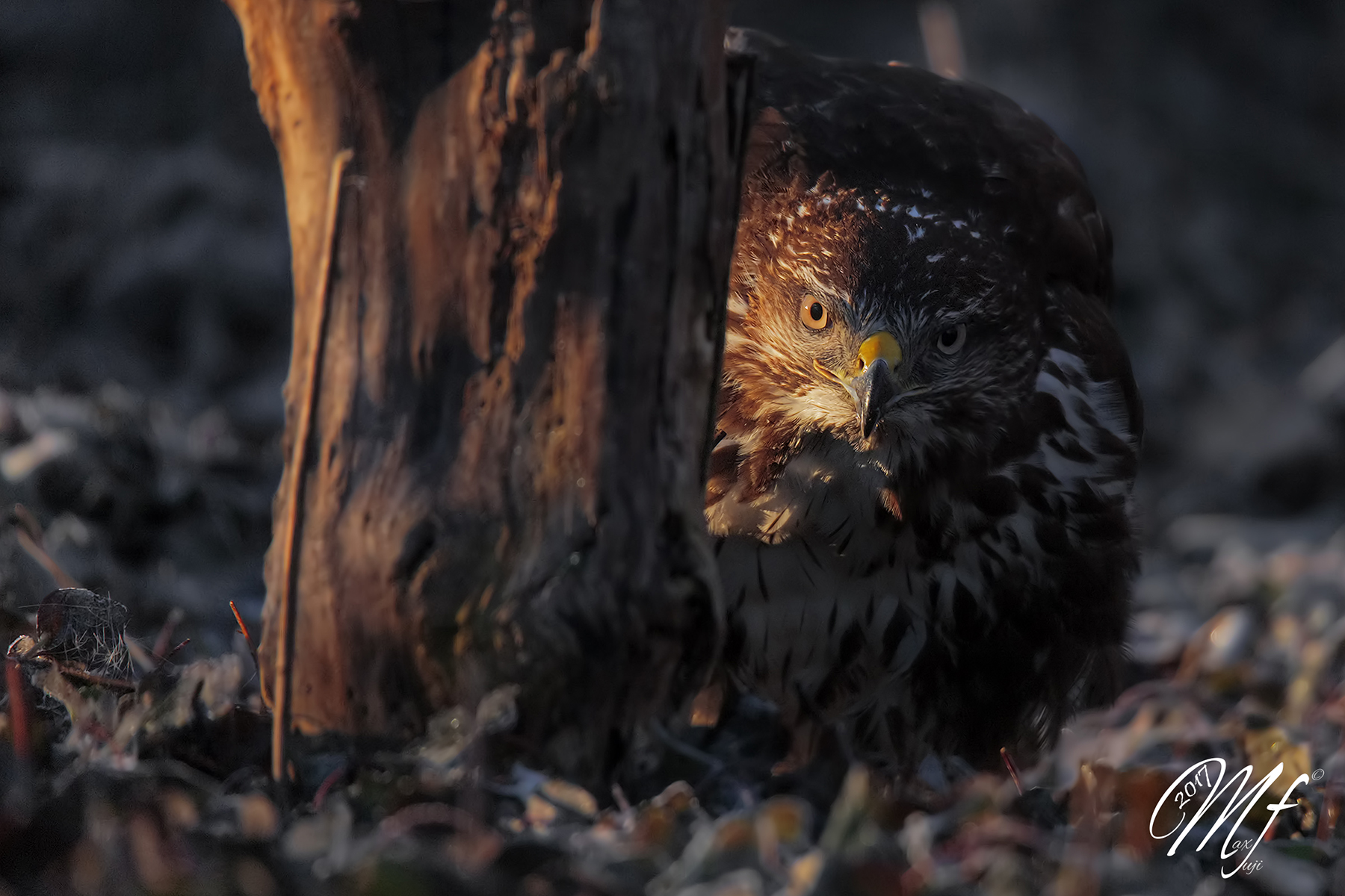 Questa mi era sfuggita...immagine fuori dal comune, fuori dal coro e per questo ancor più apprezzabile...quella luce radente ad illuminare lo sguardo fiero della poiana seminascosta che guarda in camera è sublime...i miei più sinceri complimenti.