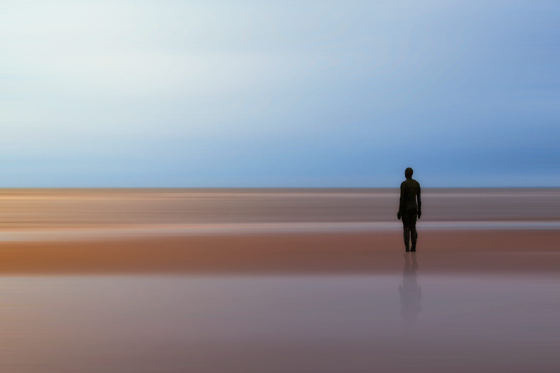 E' una delle cento statue in ghisa, a Liverpool, opera di Antony Gormley.