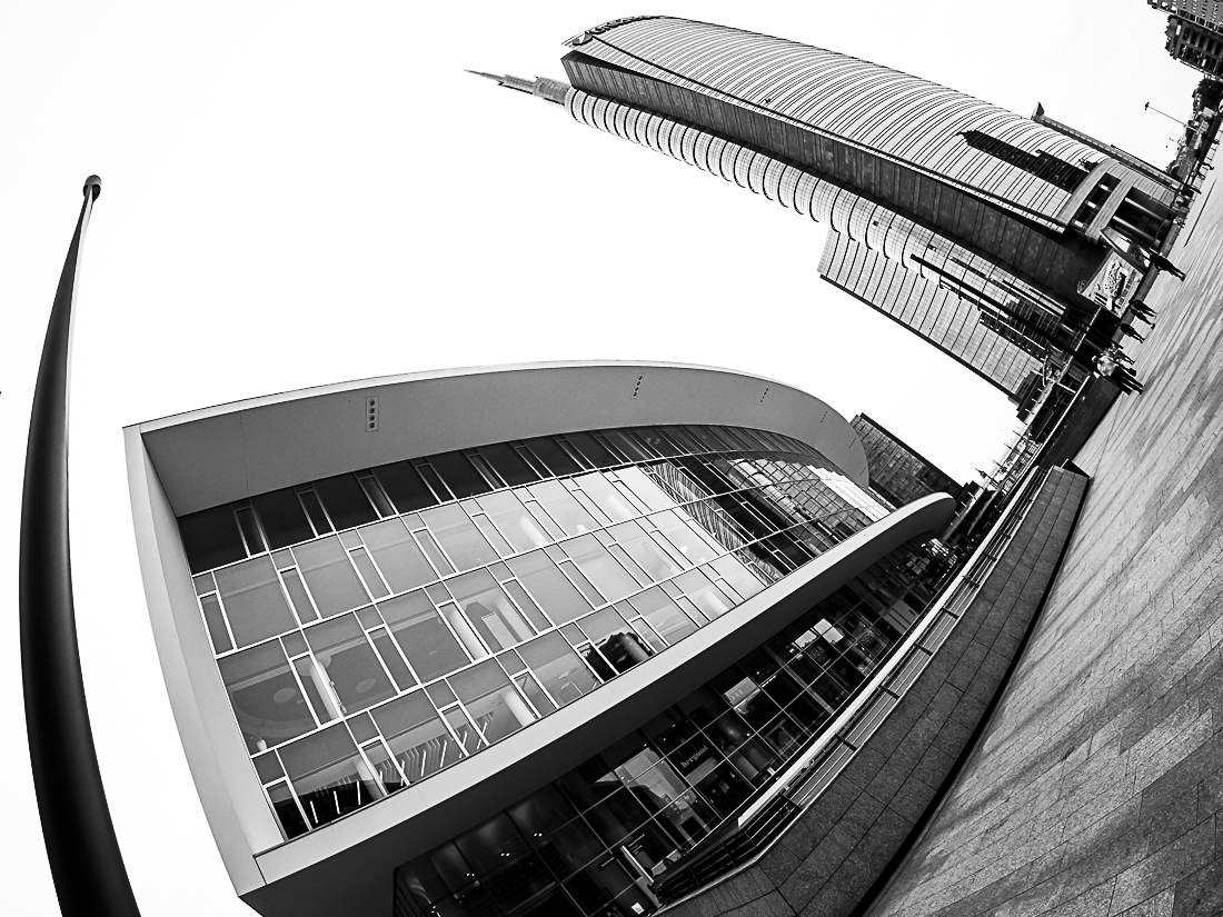 Certo, la pendenza salta subito all'occhio, ma è interessante come alla torre unicredit faccia da contraltare un semplice palo opportunamente deformato dal fisheye.