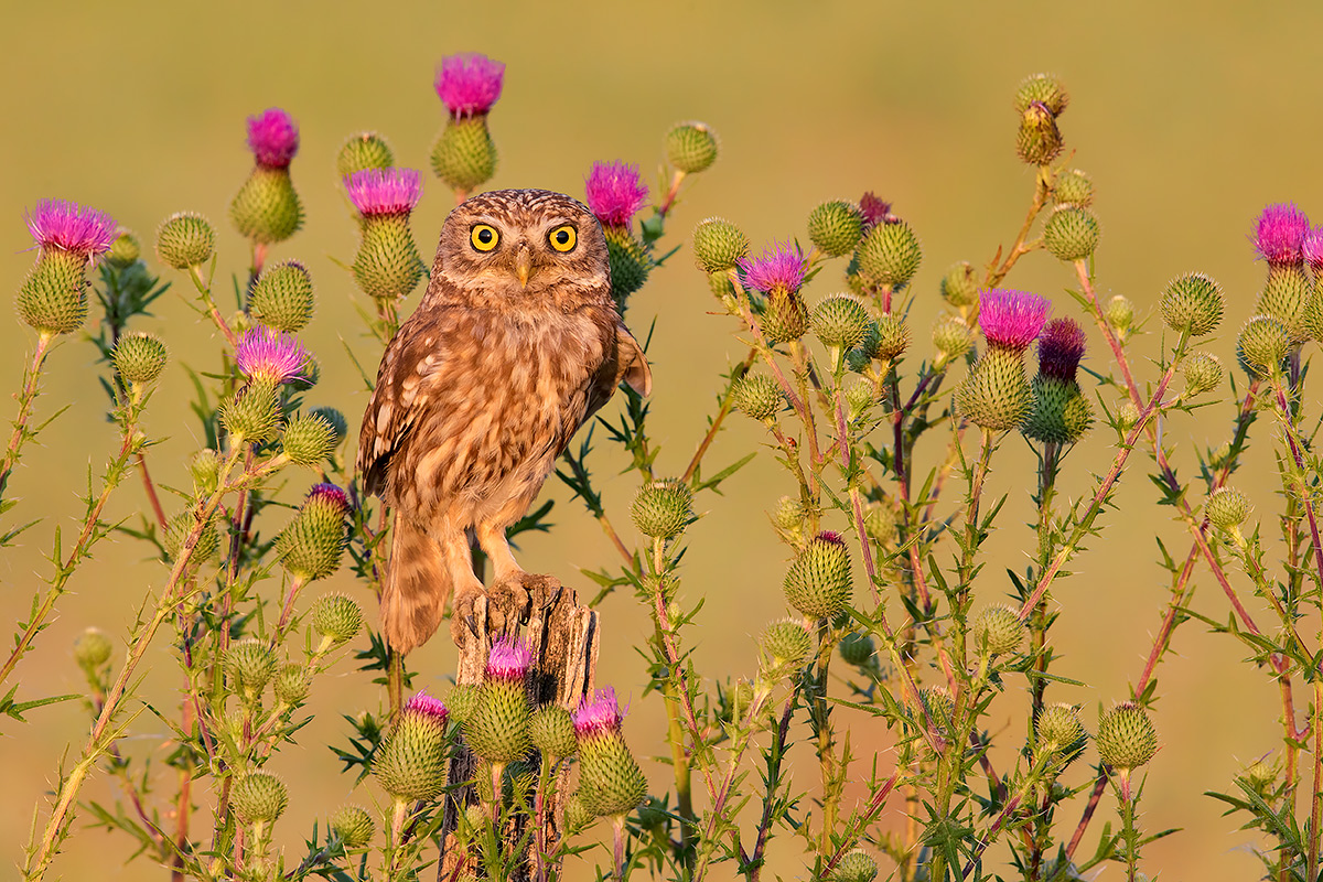 Criticare uno scatto così è molto difficile, però potrei dire che forse i cardi con la loro invadente e coloratissima presenza rubano la scena alla civetta. Scorporando i due soggetti, civetta e cardi si potrebbero avere due scatti superlativi.