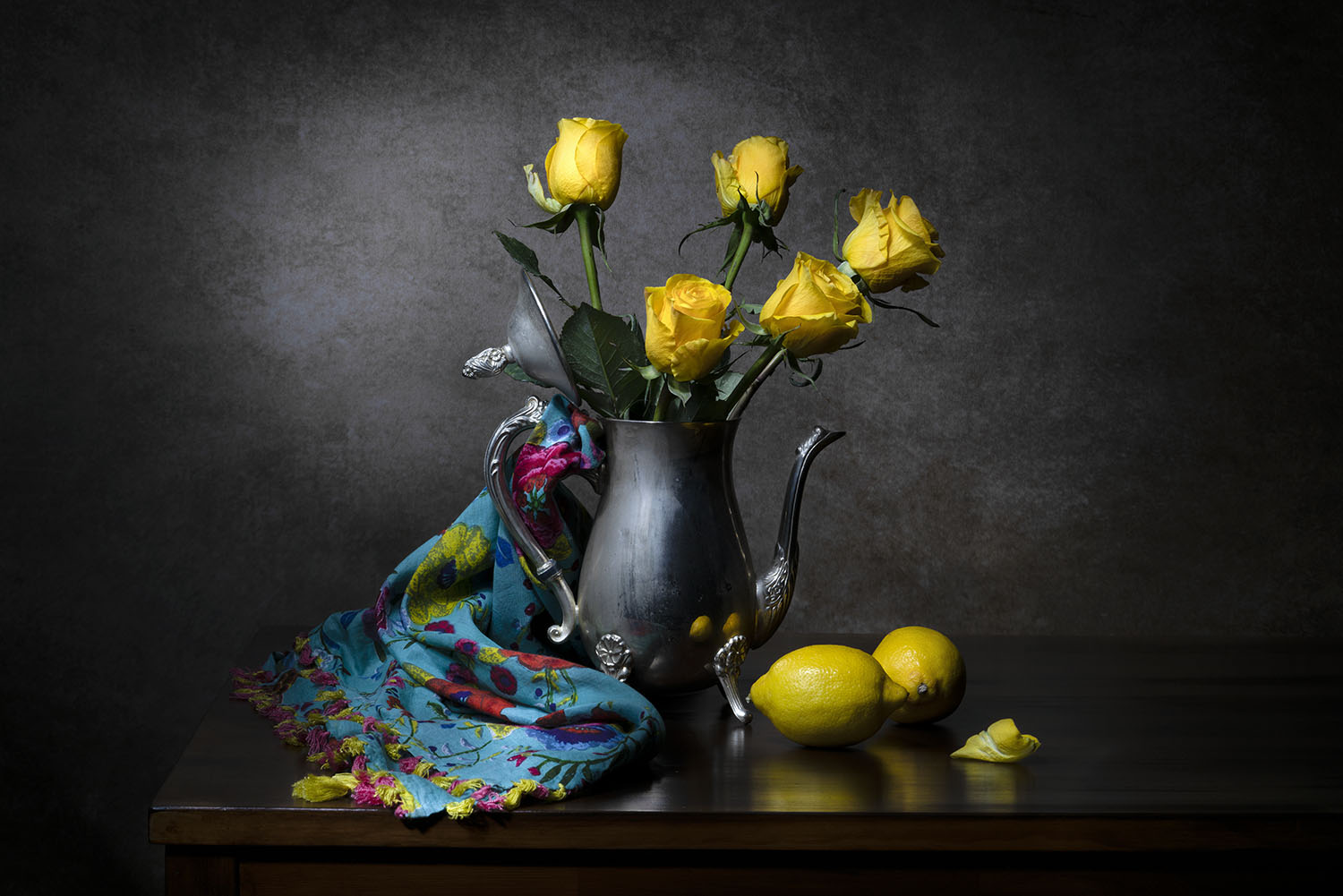 Un'accoppiata davvero inconsueta questa di rose e limoni ma d'effetto. Ben pensato sfondo grigio che richiama i bagliori metallici del contenitore. Non mi convince il riflesso dei limoni sulla brocca, meglio forse sarebbe stato averlo intero sul ripiano. Ciao 🤗