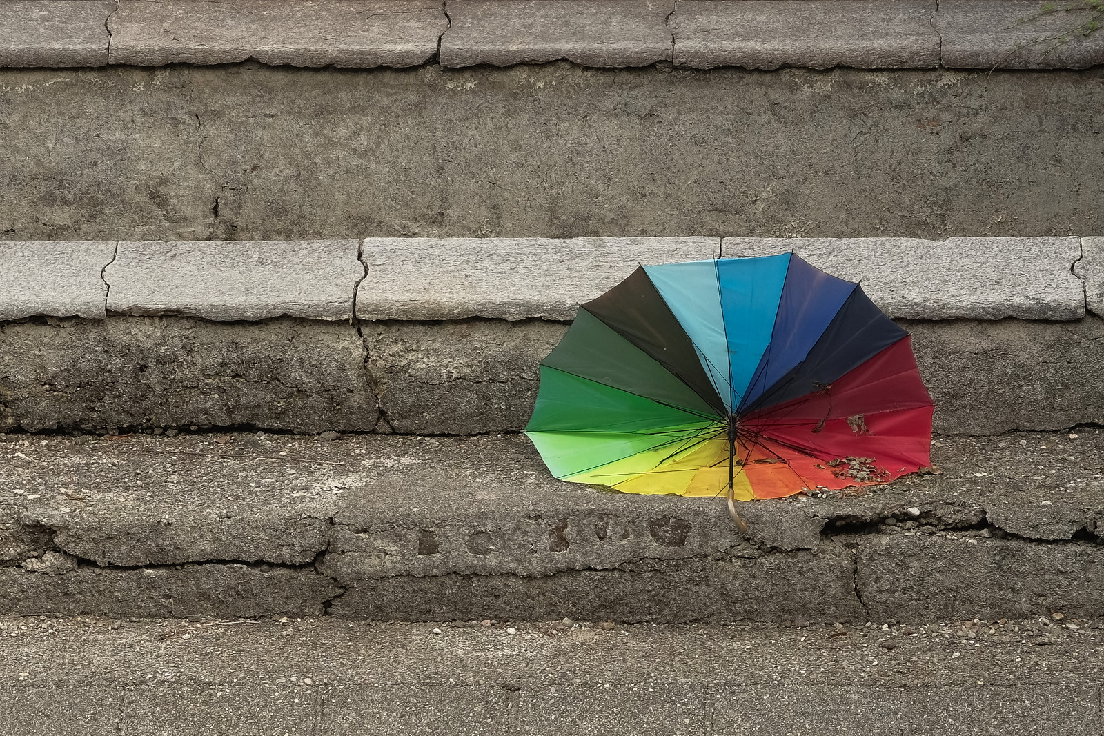 Un’immagine molto pulita e lineare con un elemento forte e di immancabile attrattiva visiva. A questo contribuisce in modo fondamentale lo sfondo. Considerando che l’ombrello è multicolore emerge che: lo sfondo ha una colorazione spenta e per nulla vivace (antitesi cromatica soggetto – sfondo, molto forte). Lo sfondo è lineare con una divisione orizzontale data dai gradini ma pure dalle due strisce bianche. Tale linearità costruisce un’ulteriore differenziazione, questa geometrica, con la forma arrotondata dell’ombrello. Quindi due fattori di differenziazione scale/ombrello che ne sottolineano presenza e diversità: colori – forme.