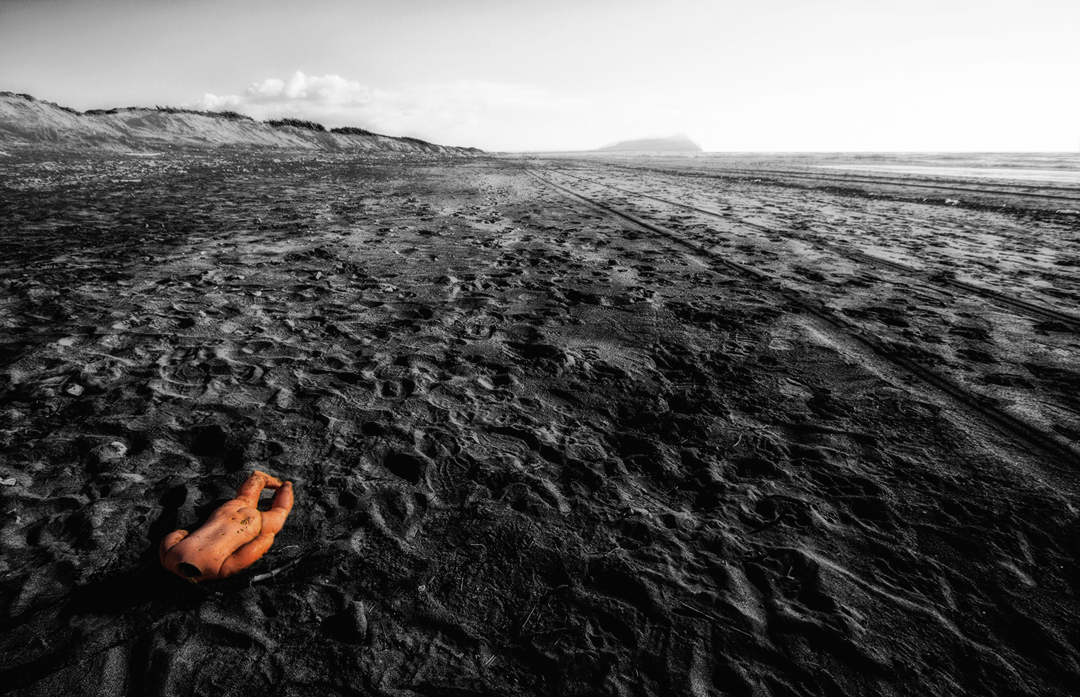 Drammatica, il bambolotto senza testa ed a colori, come avesse un'anima. Si staglia su questa desolata e deserta spiaggia. A dx le gomme tracciano linee parallele che portano lontano, in profondità verso...