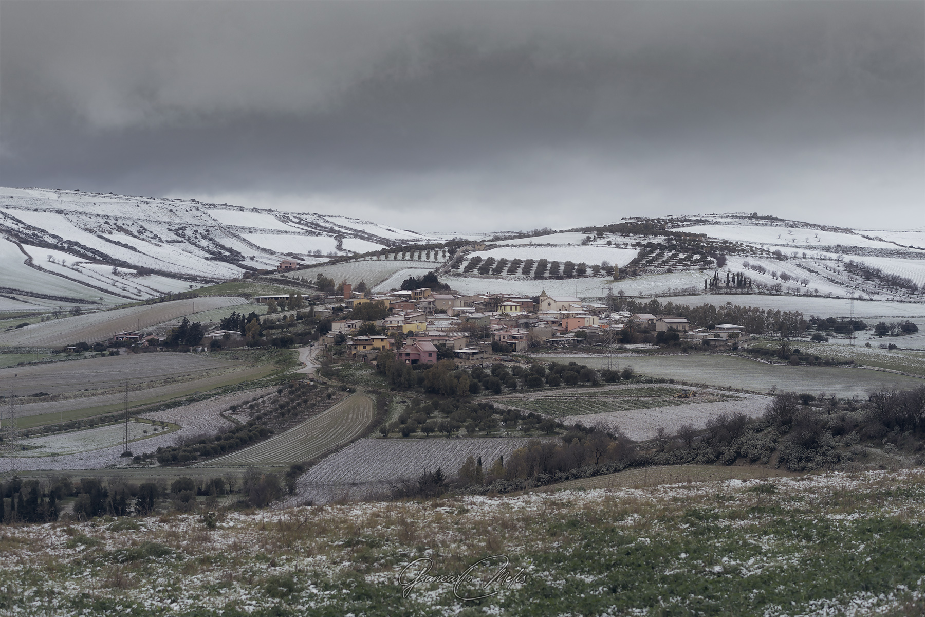 Un piccolo paesello del sud Sardegna spolverato da un nevicata, fenomeno che da queste parti è tutt’altro che frequente.