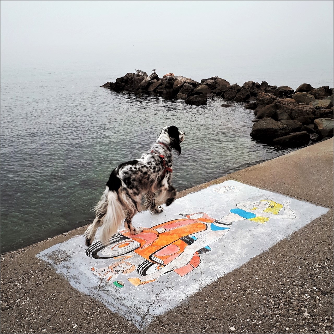 L'interazione tra il cane e la figura disegnata è simpatica. E c'è anche il piccolo cagnolino in basso che fa da rimando. Il cane è quasi in posizione di punta verso l'orizzonte che morbidamente sfuma verso l'infinito in una bella composizione ad incastro tra primo piano e la sporgenza di rocce. Mi piace  _________________ - Fotografo della domenica |