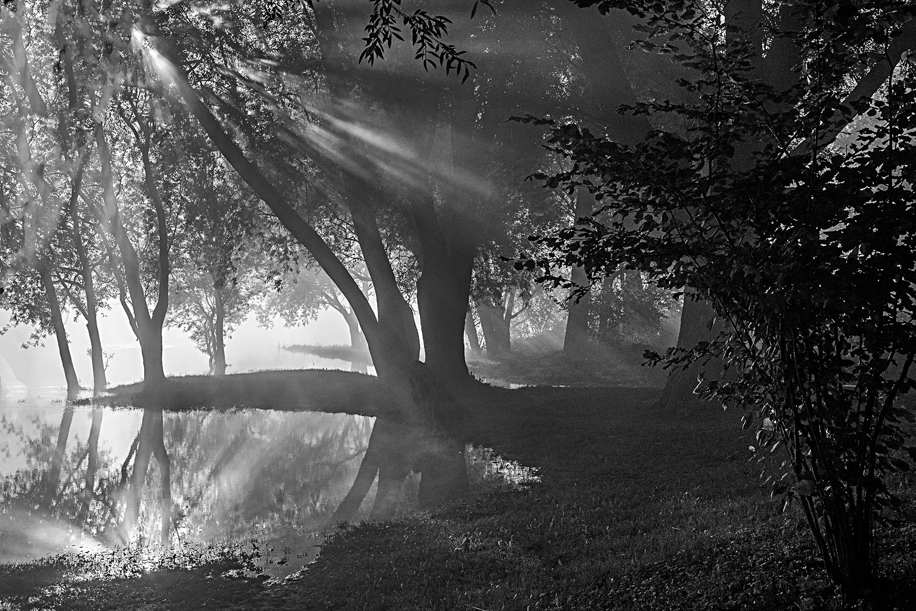 | Bello questo gioco di ombre e riflessi come anche i fasci di luce che si fanno strada tra il fogliame. Non escluderei l'idea di un formato quadrato dando più importanza alla parte sinistra Bella proposta in bianco e nero. Un saluto, guido |