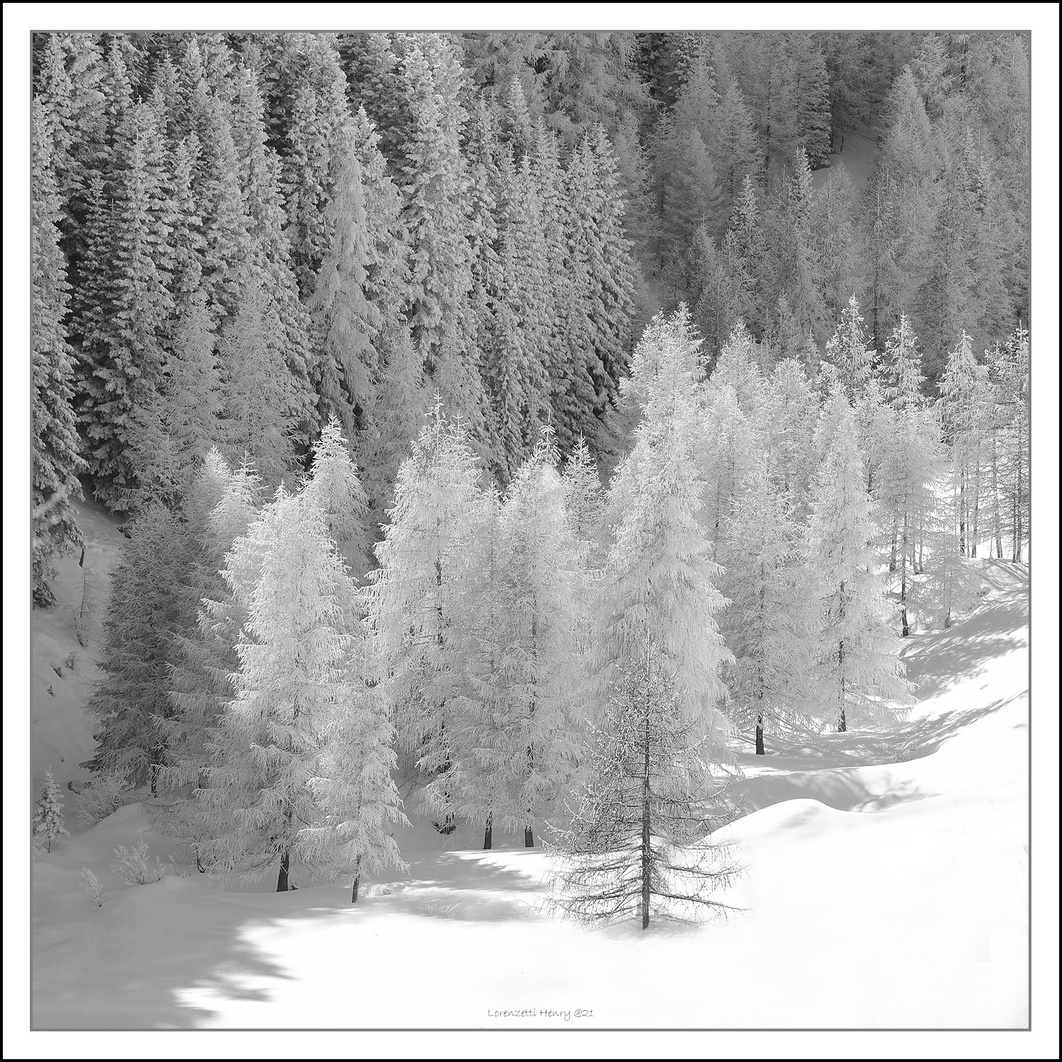 Immagine di grande suggestione… bellissima in tutto, composizione, nitidezza, formato… Mi colpiscono particolarmente le tre fasce di tonalità, dal bianco della neve a terra, al grigio chiaro degli alberi al sole, fino al grigio più scuro degli alberi in ombra. Fantastica.