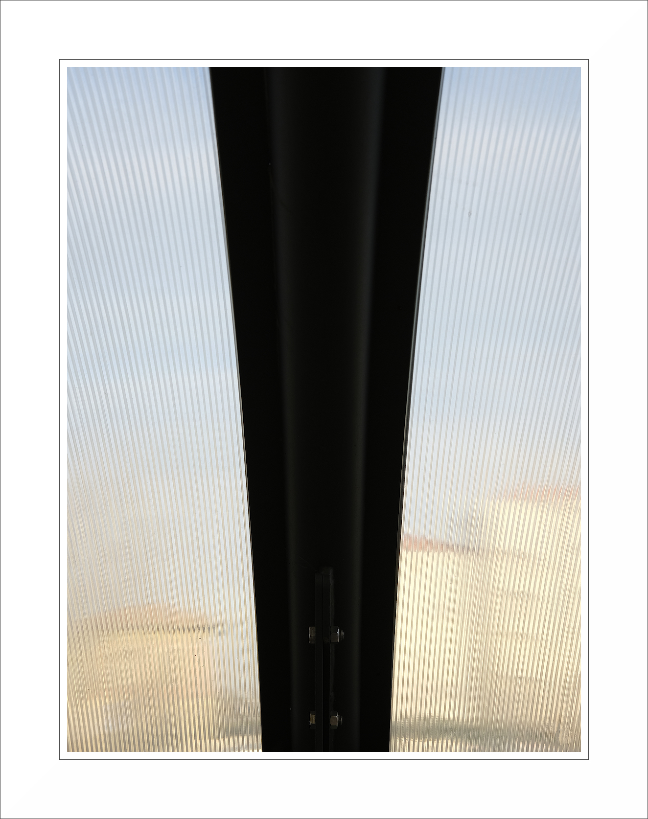 Una bella idea… una ripresa dal basso che diverge in alto e crea questa sorta di apertura nel frame… Belle le case dietro il vetro rigato, dai tenui colori in contrasto con la parte nera centrale… Un’immagine visionaria, coinvolgente… Molto bravo!