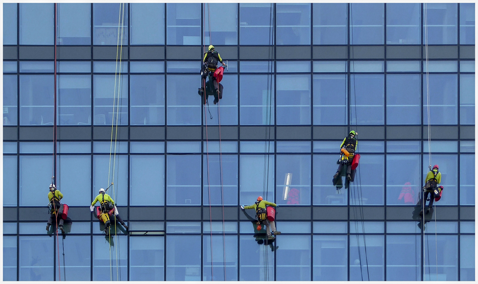 Molto bella questa immagine, dove questi uomini molto intenti al lavaggio della grande vetrata, sei ben riuscito ad immortalarli molto bene..
