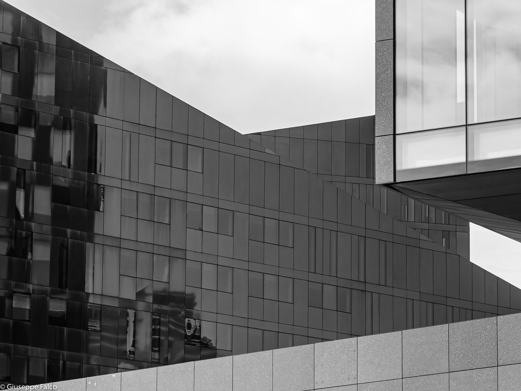 La composizione, come ti hanno detto, è mirabile perchè "strapazza" l'occhio in modo ordinato facendolo andare su e giù per il frame. Per mio gusto personale molto equilibrata la resa del cielo che deve accompagnare senza divenire protagonista, Buono il grigio della diagonale in basso, mentre ho qualche dubbio sulla resa della parte centrale dove il vetro non sembra, per quanto scuro, rimembrare quelle peculiarità di brillante riflessività. Naturalmente sono notazioni personali e nel globale la tua proposta mi piace e soddisfa. Un saluto _________________ Lodovico |