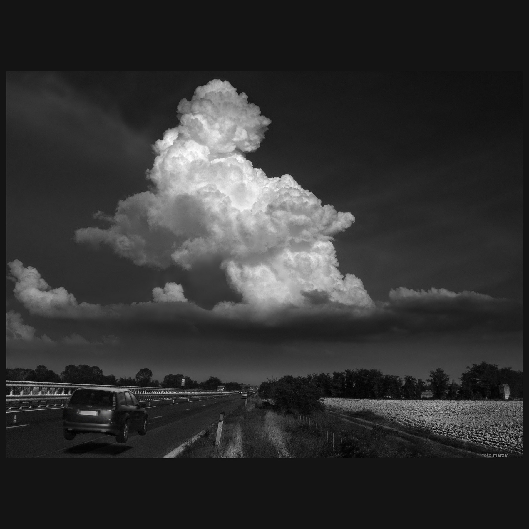 La composizione è precisa e curata con la auto sospese, attratte dal magnetismo di questo corpo nuvoloso che cattura non solo lo sguardo.