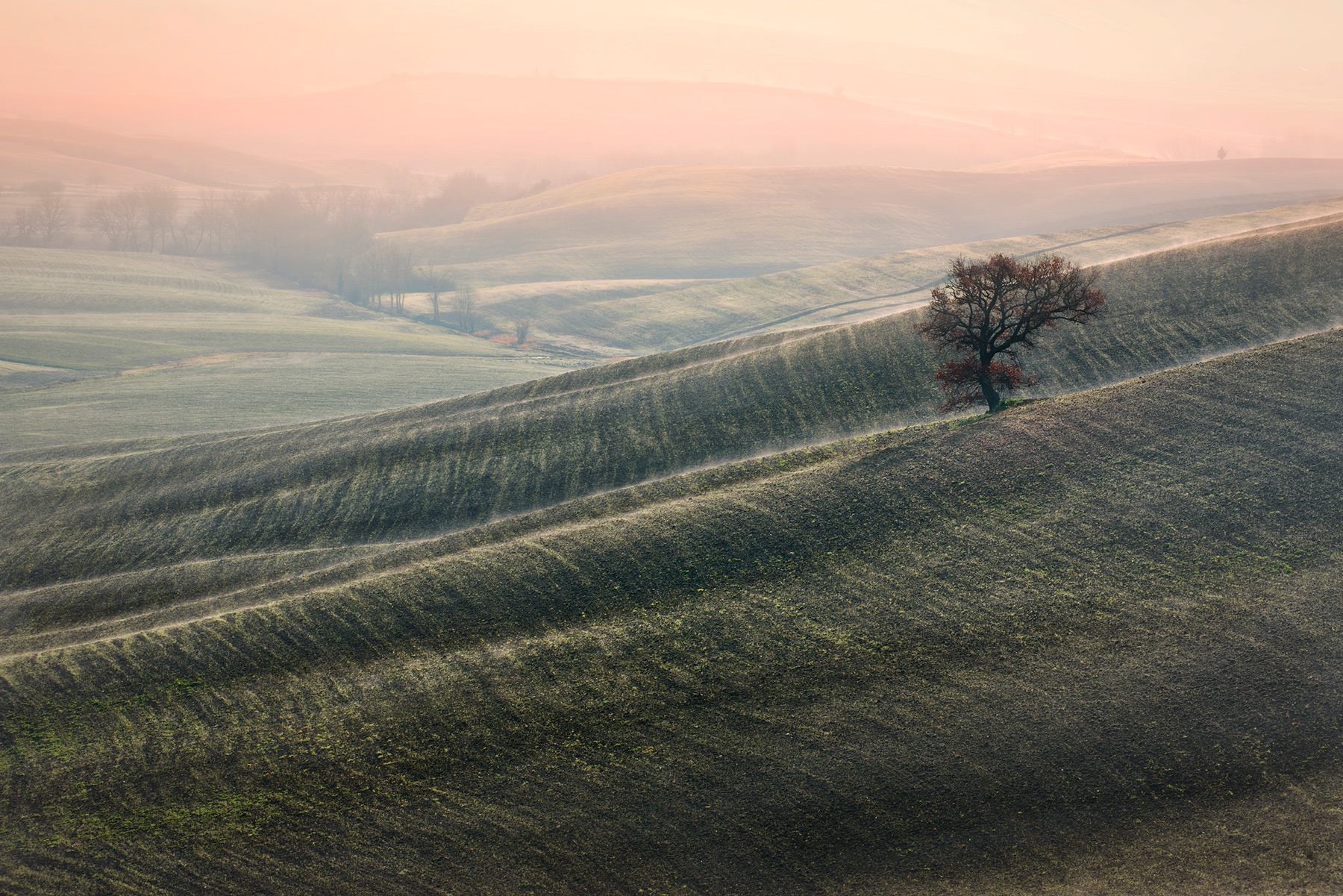 Speciale e prezioso questo paesaggio. Un primo piano diagonale di un prezioso tessuto di panno morbido e un cielo rosato dalle zuccherine tinte. In mezzo quel vezzoso alberello un po' narciso che sa di essere l'attore principale su un palcoscenico con una bella scenografia. Gran bella immagine _________________ - Fotografo della domenica |