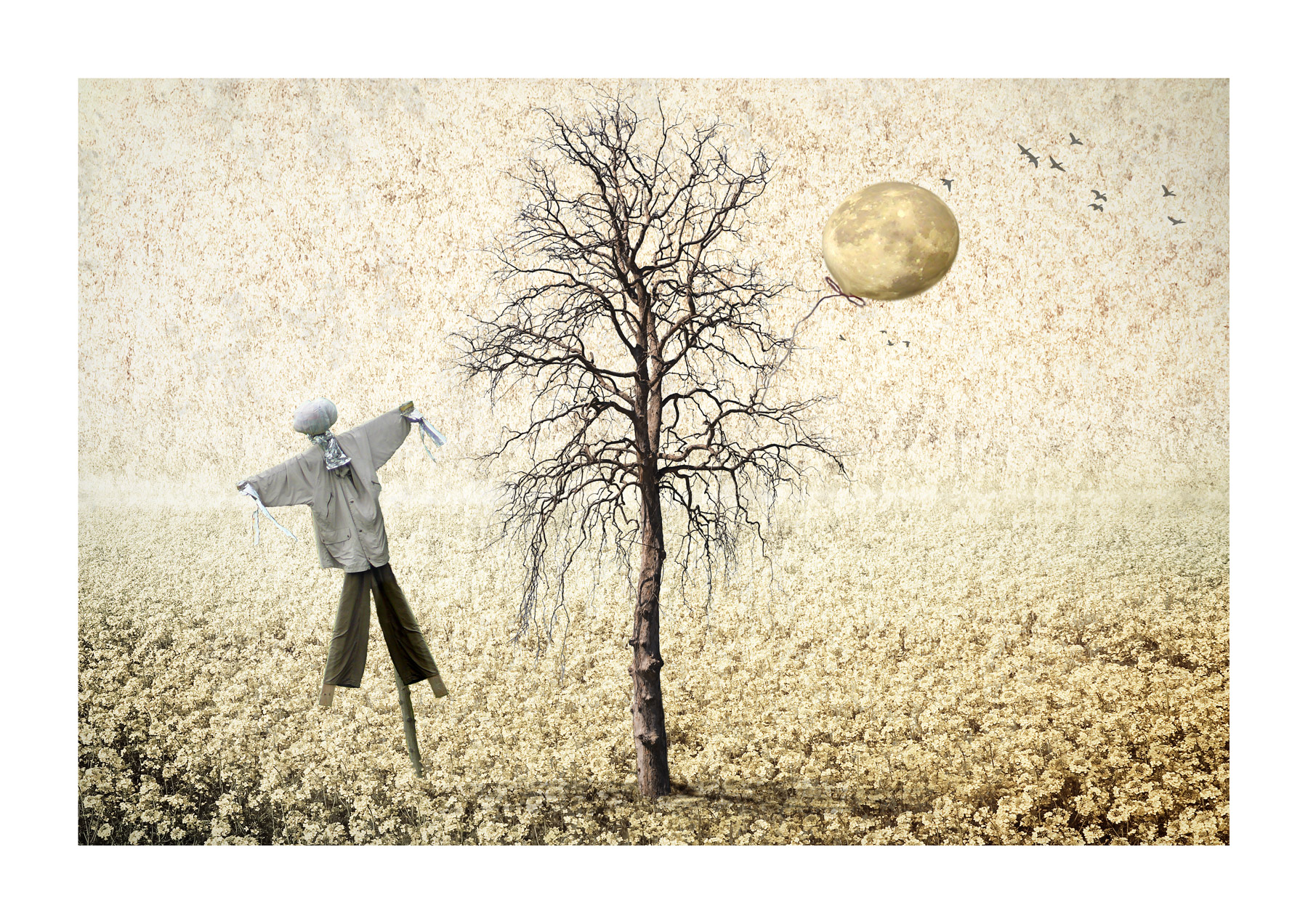 lo spaventapasseri stava giocando con la luna nel campo di colza, ma la luna gli è sfuggita di mano e si è impigliata fra i rami dell'albero. Lui è piantato a terra e non riesce ad andare a riprendere il suo gioco...