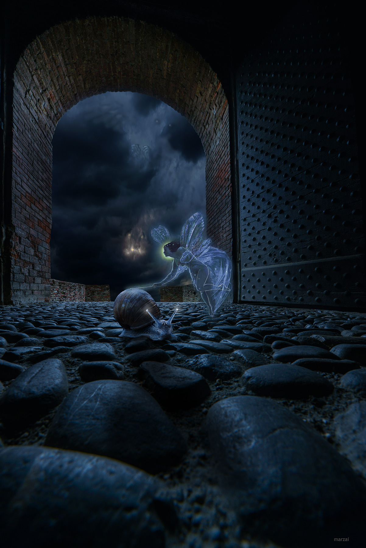 Amici mi hanno chiesto di esplicitare gli elementi di questo lavoro, dunque: l’androne di ingresso della rocca di Fontanellato, la chiocciola e il cielo sono scatti che ho realizzato in giornate diverse (cielo lavorato in certi punti con gli strumenti scherma e brucia di PS per farvi comparire le figure) ; poiché per costruire le atmosfere trovo congeniale contaminare, la fata Mab ( la shespiriana levatrice delle Fate, nominata da Mercuzio in Romeo e Giulietta) l’ho disegnata copiando con variazioni un dipinto di John Atkinson Grimshaw ( 1836-93 ).