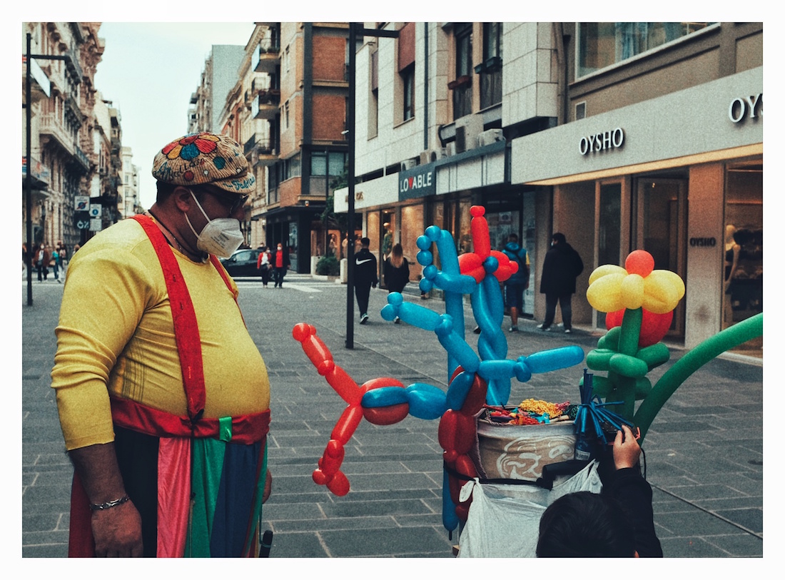 Bello l'accostamento di colore tra gli abiti dell'artista ed i palloncini.