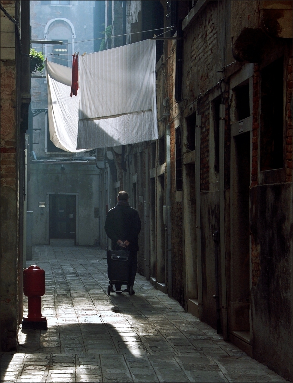 | Un vicolo con una luce che “illumina” biancheria e passaggio umano......bella immagine fotografata molto bene |