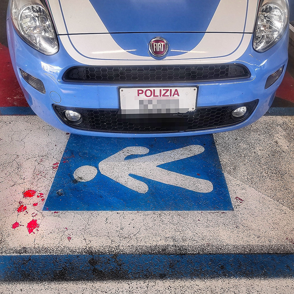 Auto della polizia, simbolo della salvaguardia del cittadino, a un passo da un segnale pedonale (e già qui il contrasto è forte), immortalata come se avesse appena investito il povero stickman con attorno evidenti macchie di sangue. La tragedia è teatralmente servita.