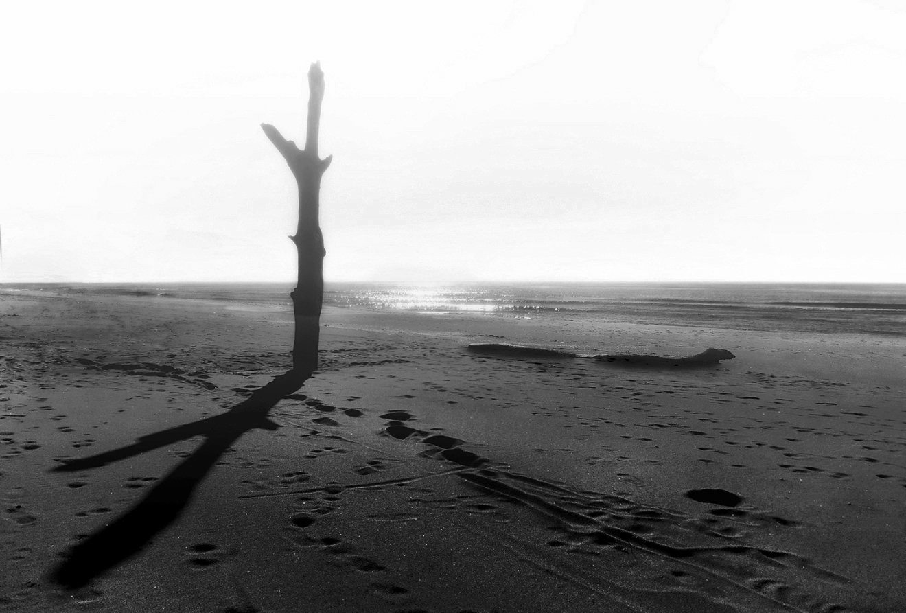 Un paesaggio marino malinconico e un po' spettrale. Il tronco piantato nella sabbia come un totem lascia dietro di se un ombra dura ottimamente collocata sulla diagonale.