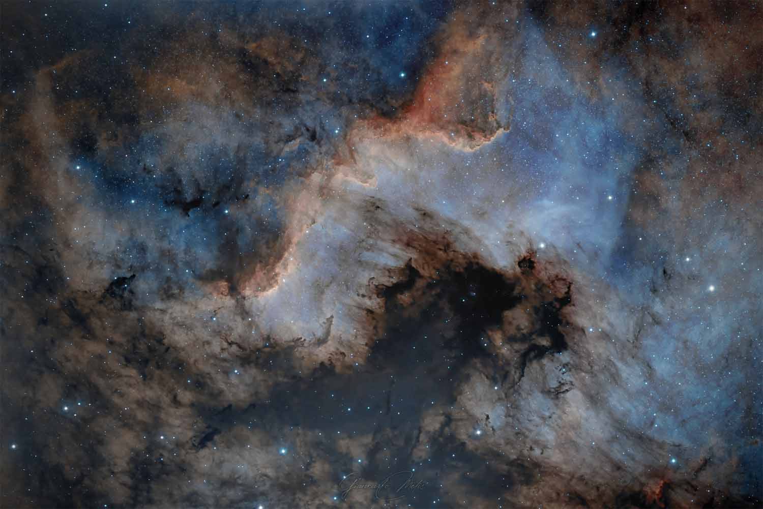 Cygnus Wall, un parte inferiore della nebulosa Nord America (NGC 7000) nella costellazione del Cigno. Una zona in cui si formano le stelle, ripresa con un Celestron RASA 8 (400mm di focale a f/2) e una camera di ripresa a colori (ASI 183 MC-Pro). La ripresa è stata fatta in banda stretta (filtro bi-banda Ha+OIII). Elaborazione in HOO (idrogeno sul canale rosso, e differenti combinazioni dell'ossigeno ionizzato sui canali verde e blu). Totale scatti: 30 da 300" + 10 Dark.