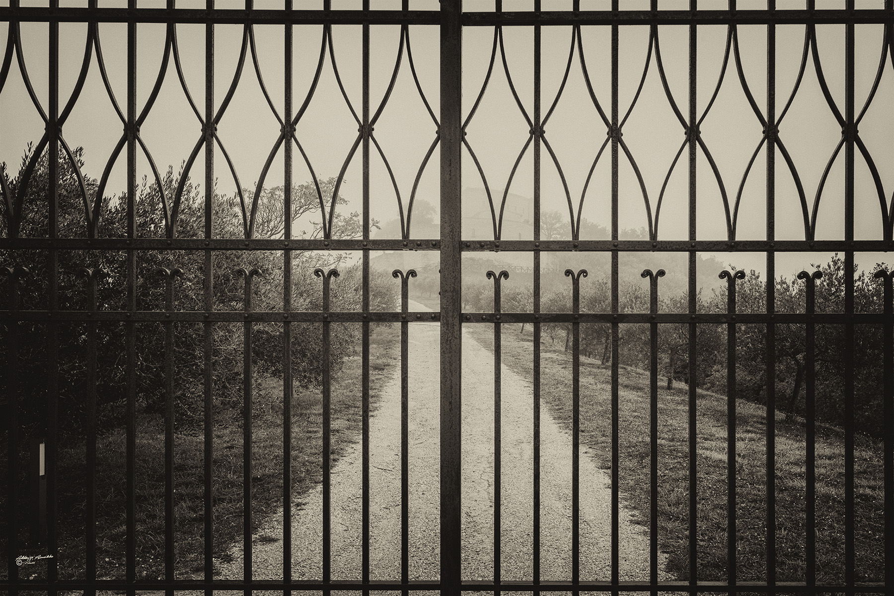 Il cancello in PP come un elegante guardiano impedisce l'accesso ma non la visione di questo scorcio. Bella la stradina che di perde gradatamente nella foschia. Mi piace particolarmente il monocromo, un bn e viraggio immagino che dono quel tocco di antico, vissuto che si abbina perfettamente alla scena