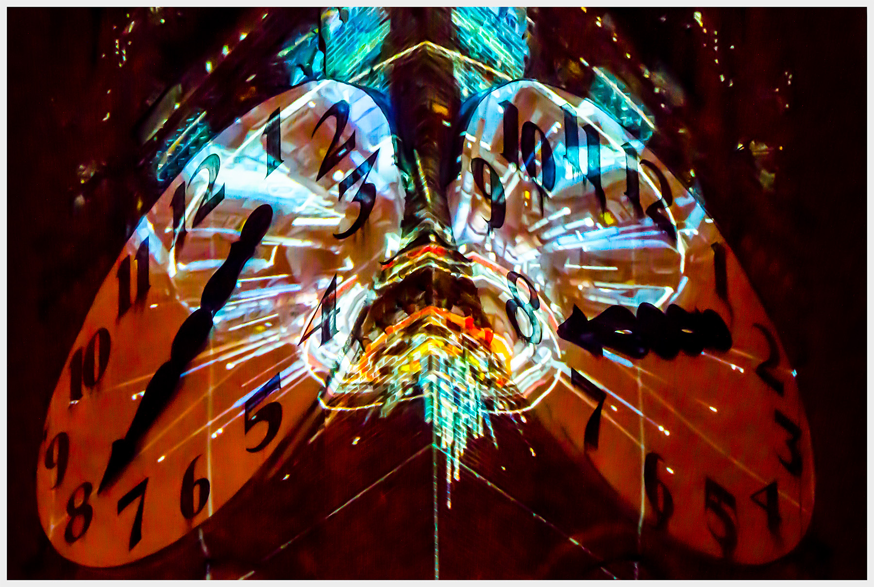 Gioco di luci sull'orologio della Torre del Belvedere di Mondovì.