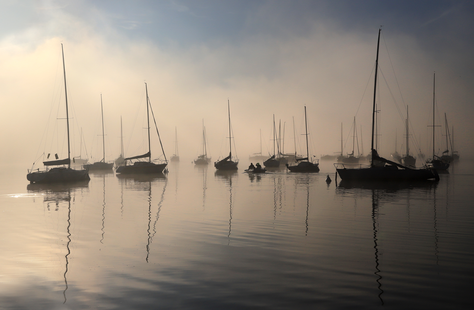 Magnifica la separazione tonale tra barche in primo piano e quelle più fumose al largo.