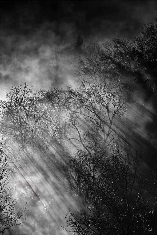 Wow,questa è bella davvero! Le lame di luce trafiggono i rami e la foschia,il tutto avvalorato da un gran BN. Complimenti!  _________________ Massimo Facco