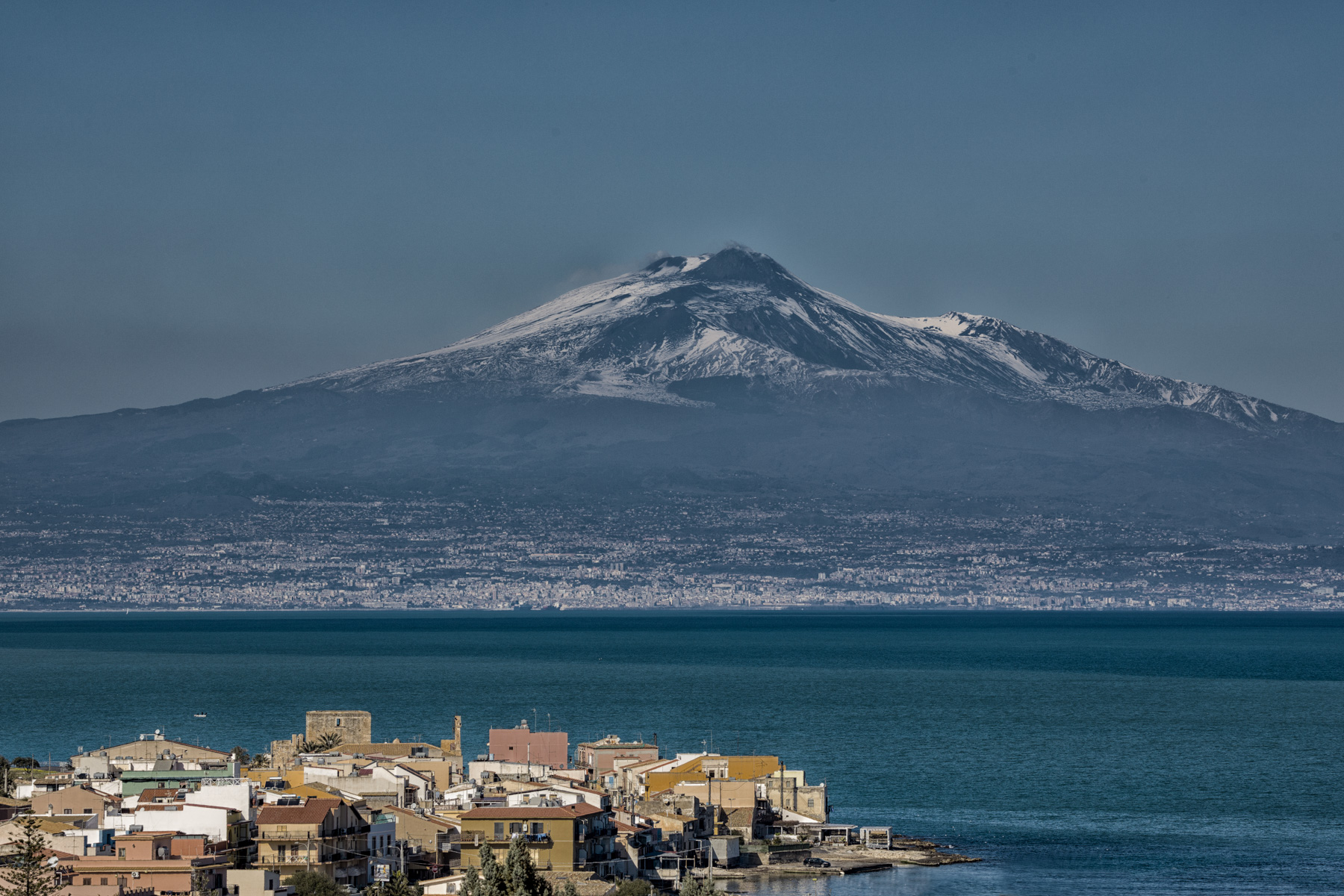 Lo scenario è davvero bello .. una piacevole contrapposizione tra caldo e freddo, un bel dialogo tra la frenesia umana e la placida maestosità della natura. Mi sembra di notare degli aloni chiari lungo il perimetro dell' Etna.