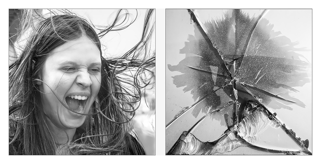 Questo dittico è composto da due fotografie che si completano e rafforzano l’una con l’altra. Io personalmente ci vedo una doppia lettura. Quella che “arriva subiti” è incentrata sull’urlo della bambina e la conseguente rottura dello schermo di vetro. Azione e conseguente reazione. La seconda sensazione che mi è arrivata (anzi, a dire il vero mi è arrivata prima…) è una sorta di conseguenza fra immagine della bimba furiosa ed oggetto in frantumi…quasi fosse lei stessa ad andare in pezzi come conseguenza della sua ira….una sorta di frattura di sé stessa e della sua anima (sono forse un poco folle in questo ragionamento ?....). Rabbia che ha come conseguenza non la semplice rottura di un oggetto esterno, ma una sorta di ferita verso il proprio io. Ira conseguenza di……qui’ sta il bello. Ognuno è capace di credere e formulare pensieri e congetture a lui affini.
