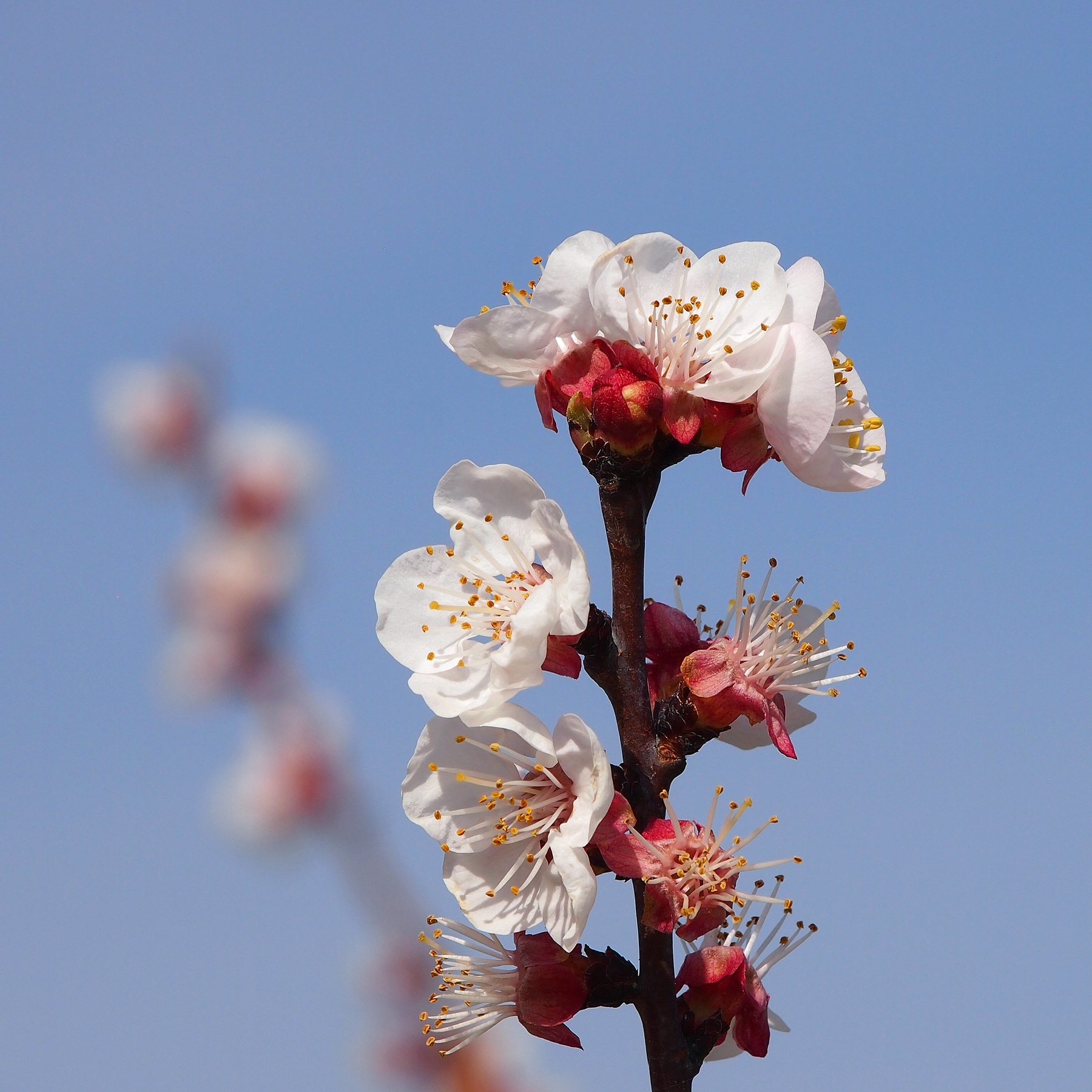E' semplice e qui sta la bellezza elegante di questo fiore di albicocco coi suoi sgargianti colori stagliati contro un cielo blu rilassante.