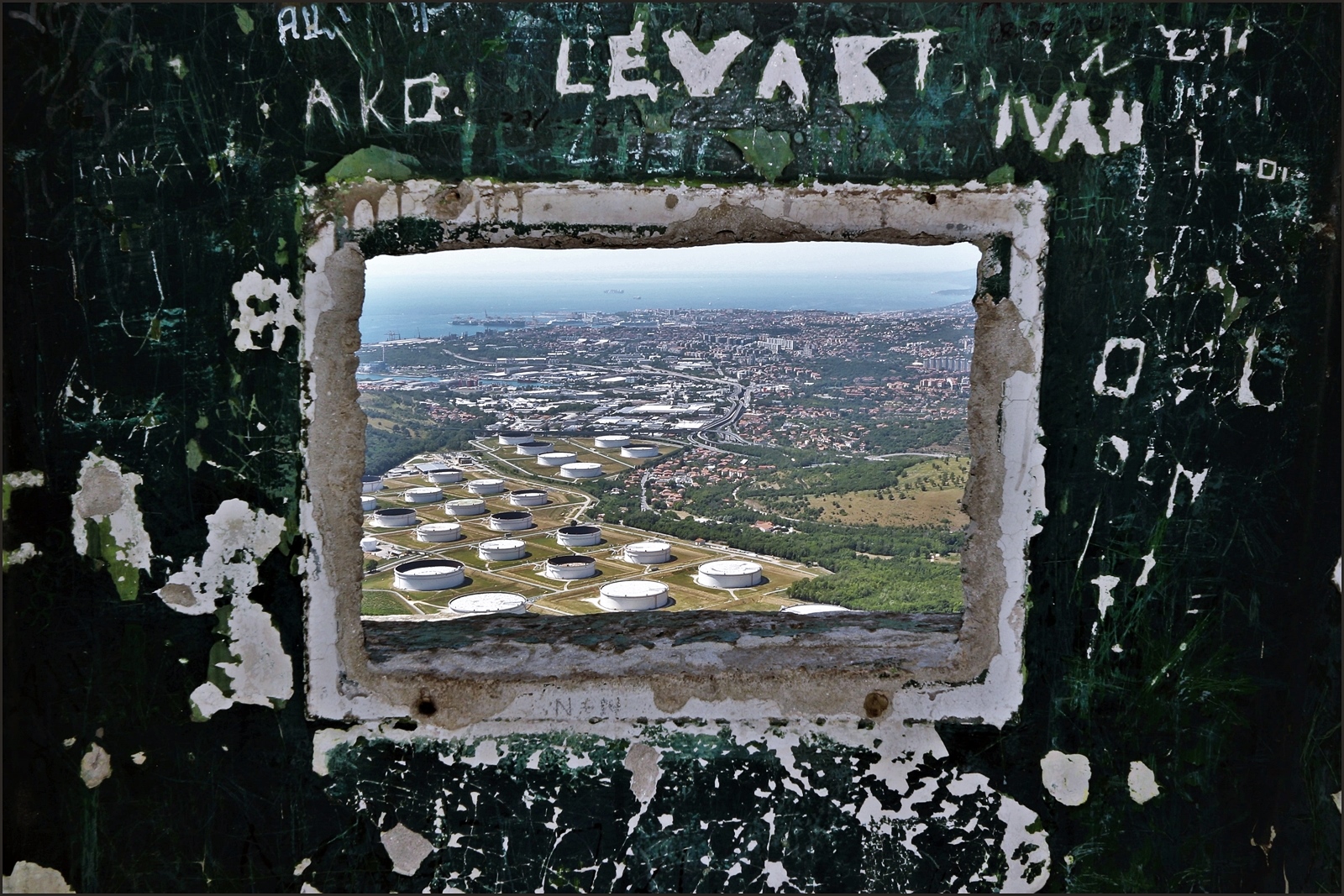 Incredibile il punto di ripresa tanto che viene proprio da domandarsi da dove hai scattato. Sembra un rudere in collina. La città con la sua laguna si riesce a notare chiaramente nell'incasellato di questa finestra grezza e consunta con le scritte lasciate da giovani avventori del sito.