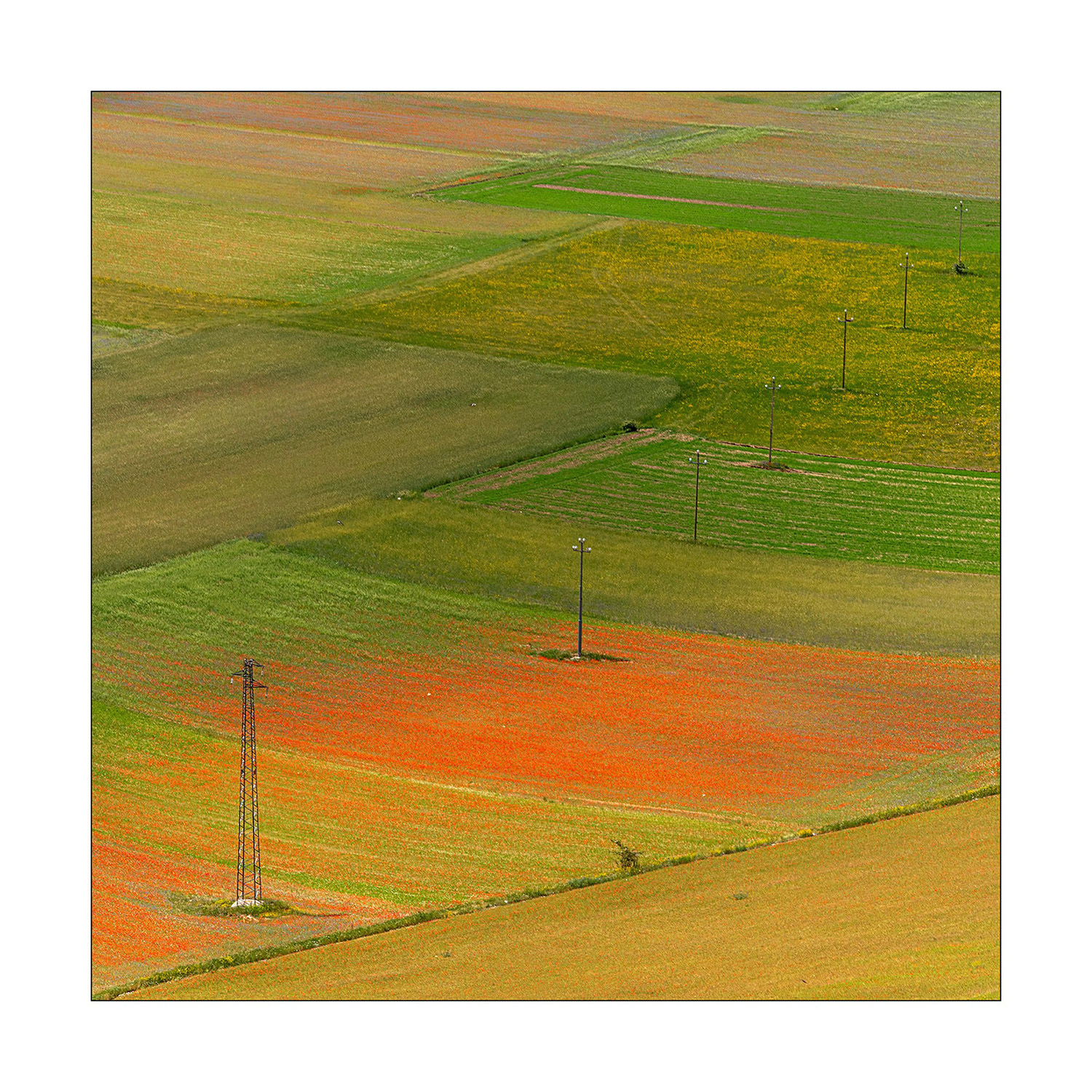 fila di tralicci sulla diagonale e fazzoletti di terra colorata dalla fioritura