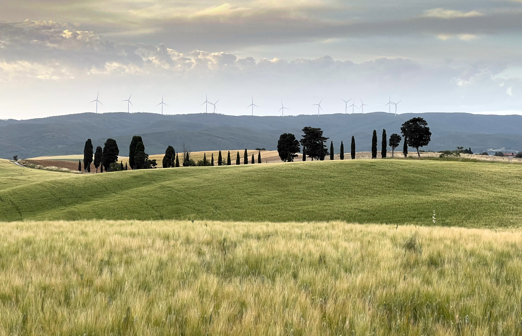 Green il prato e green l'energia prodotta dalle pale eoliche all'orizzonte